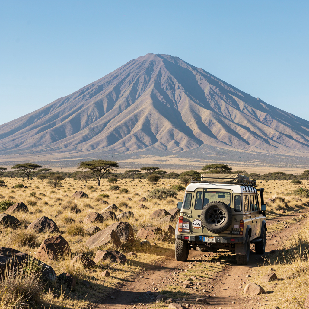 Safari vehicle on game drive with Mount Kenya mountain backdrop in East Africa