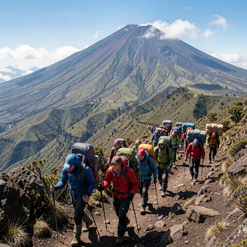 Hikers ascending Mount Kilimanjaro on Machame Route with porter support team