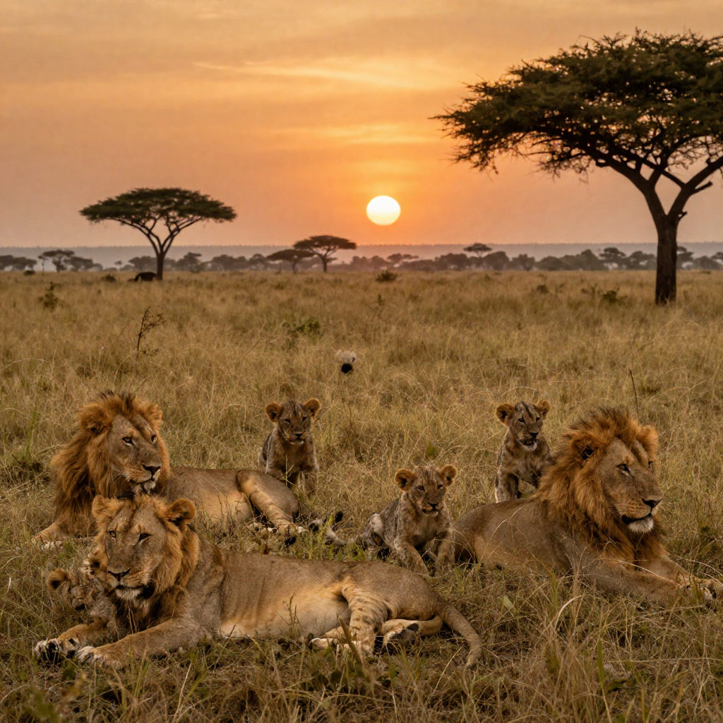 Lion pride with cubs resting in Serengeti National Park grasslands at sunset