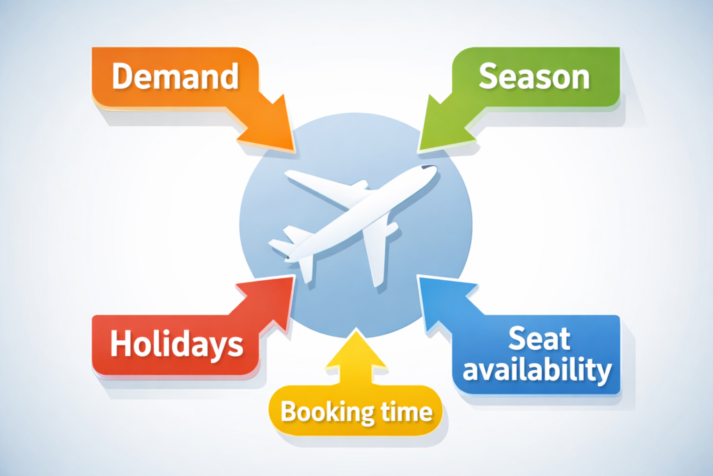 Airlines use dynamic pricing systems that adjust ticket prices based on demand, season, competition, and booking behavior. Prices often rise when demand is high such as weekends, holidays, or last-minute bookings and drop when demand is lower.