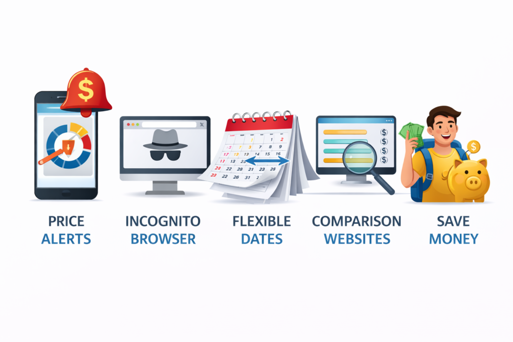 Additional tips to get the lowest flight prices is to use flight comparison websites, set up price alerts, be flexible with travel dates and airports, clear cookies or use incognito mode. Avoid booking during holidays or major events rather consider one-way tickets instead of round trips. Small changes in dates or times can lead to big savings.