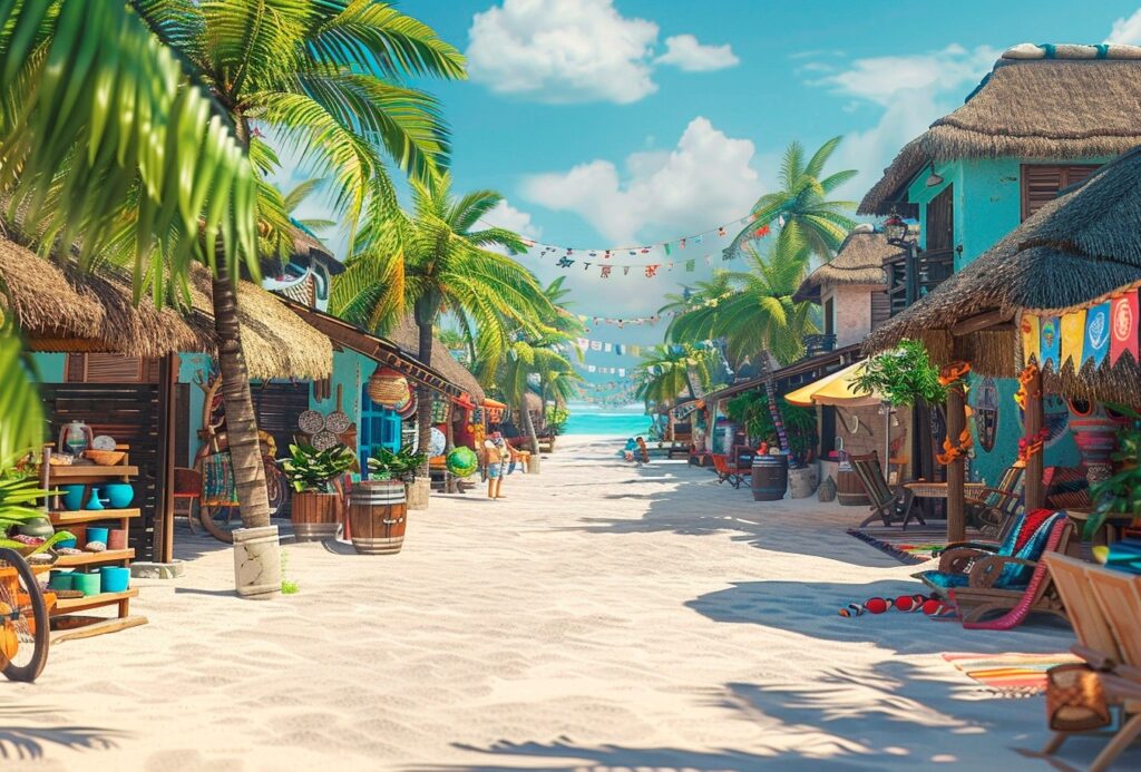 Row of colorful beach huts and shacks