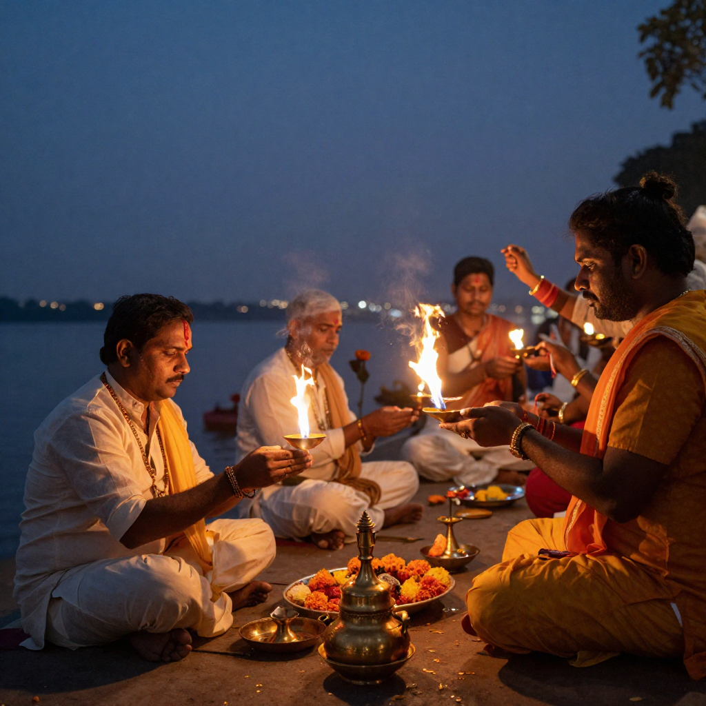 Hindu priests performing Ganga Aarti ceremony