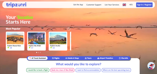 Tripzoori travel website homepage featuring popular destinations, and travel booking options