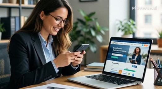 A woman in a professional suit smiling while using her smartphone at a desk with the Tripzoori travel website open on her laptop.