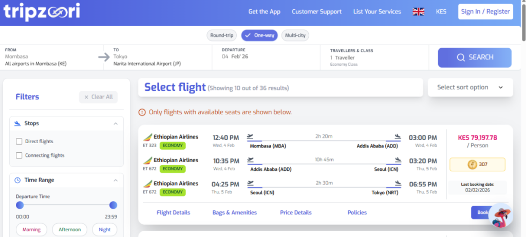 A screenshot of the Tripzoori flight search results page showing one-way flight options from Mombasa to Tokyo with Ethiopian Airlines