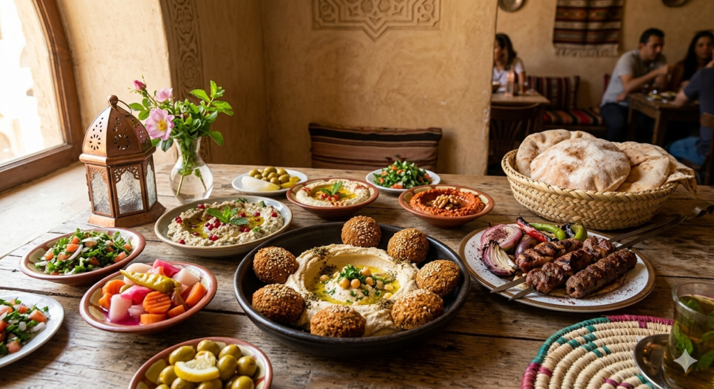 - Must Try: Order a spread of “Mezze”—small plates including baba ghanoush, muhammara, and perfectly charred lamb kebabs served with fresh, pillowy baladi bread.