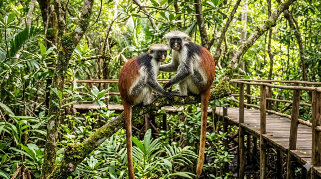 Nature enthusiasts should visit Jozani Chwaka Bay National Park, Zanzibar’s only national park and a vital sanctuary for the island’s unique biodiversity. This UNESCO Biosphere Reserve is the last remaining stronghold of the rare Zanzibar red colobus monkey, an endangered primate found nowhere else on Earth.
